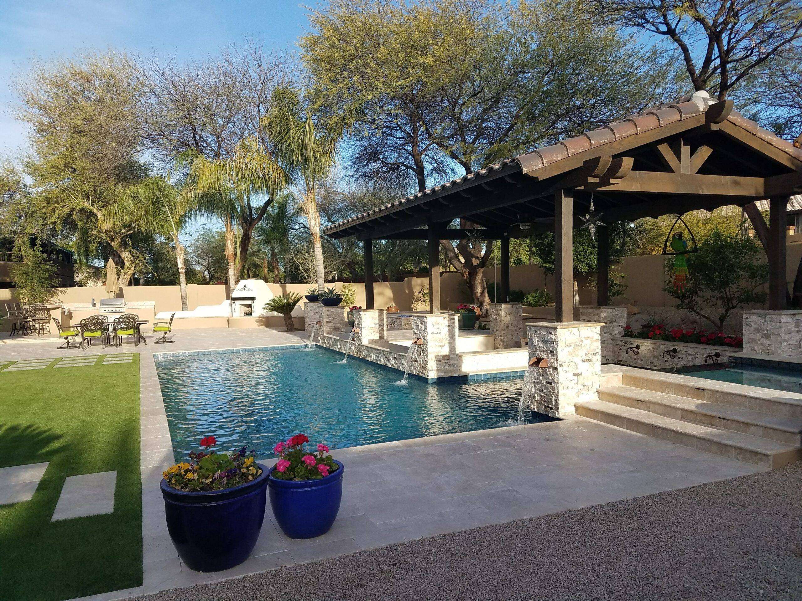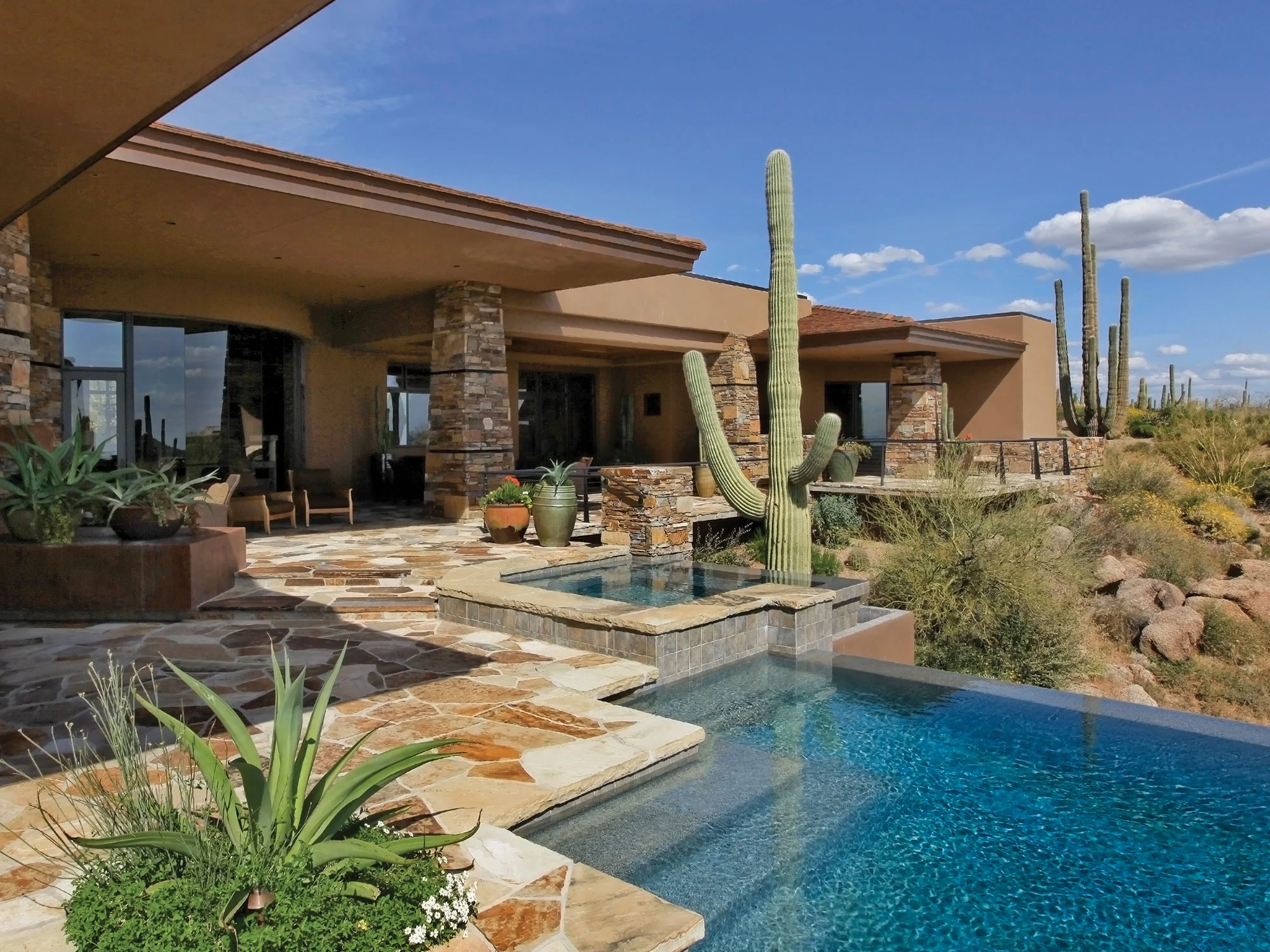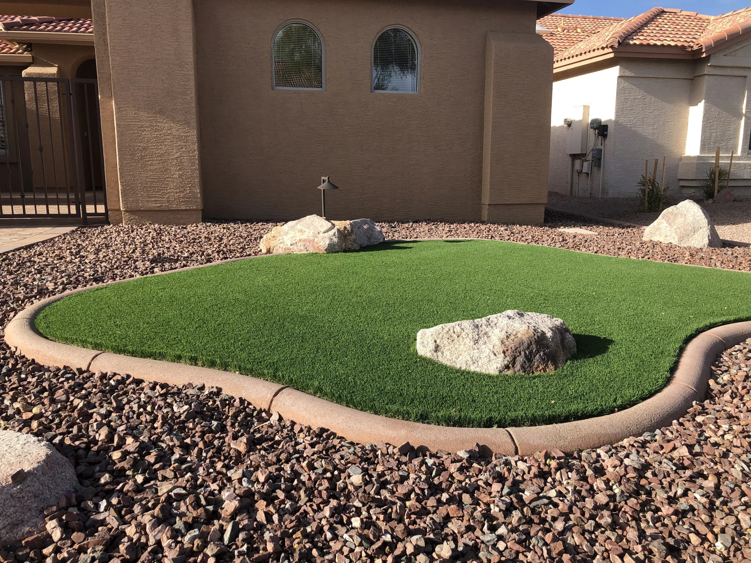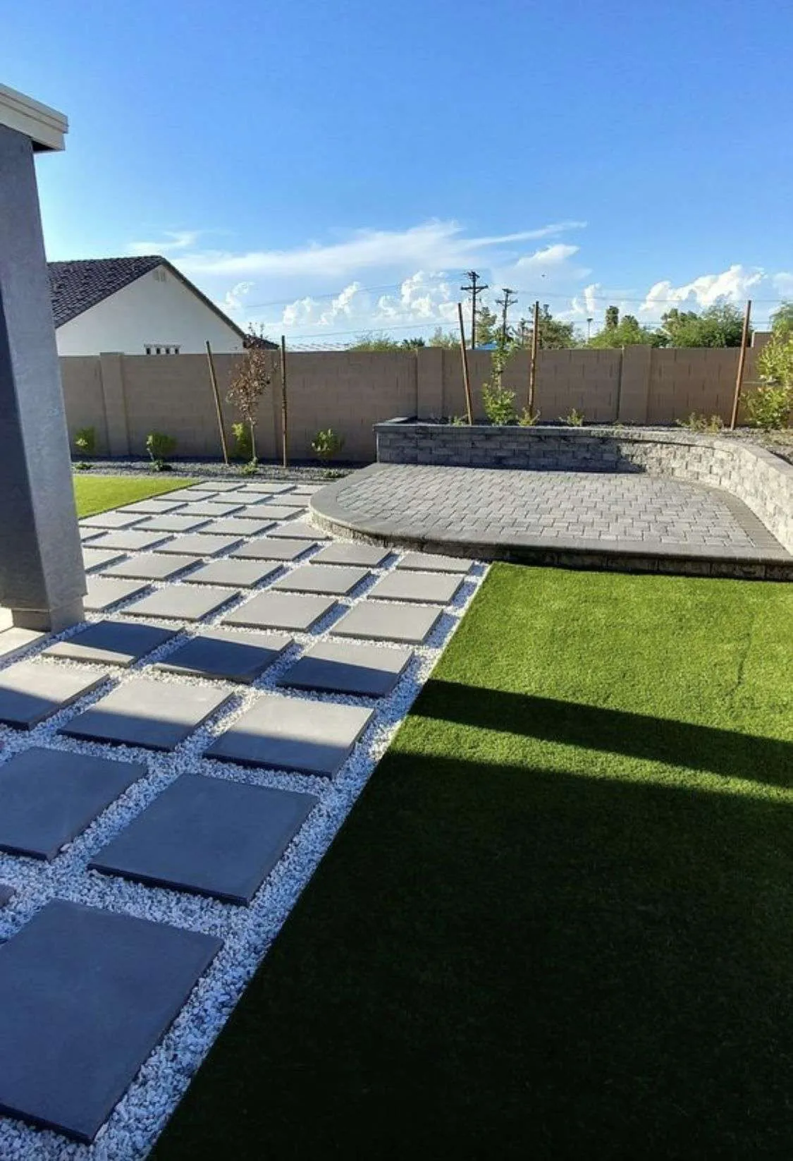 Room for seating and a grill, smooth edges near turf and planters, results that last in the Phoenix sun.